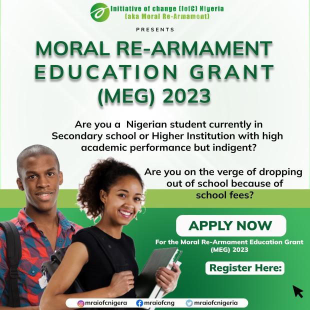 MEG will be fully funded by Moral Re-Armament/Initiatives of Change, Nigeria. It will be fully funded by the organization until partnership is secured from other well-meaning like-minded individuals/organizations. MEG grant will focus on supporting Secondary and undergraduate brilliant, indigent Nigerian students with 20 opportunities each year (10 Secondary and 10 Undergraduates) for new applicants and renewing applicants.